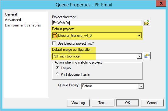 Open PrecisionForms Email and configure the email queue’s default project and change the default merge configuration to “PDF with Job Ticket.”