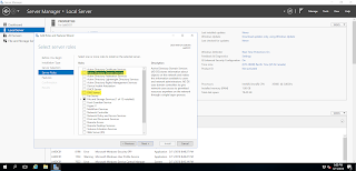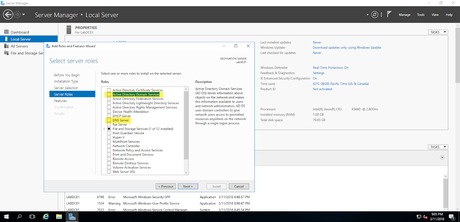 18.  Chose “Role based or feature-based installation” and the current local server, check mark both “Active Directory Domain Services” and “DNS Server.”  For each, a popup will ask if you want to add the features required for that service, click “Add features” in both occasions.