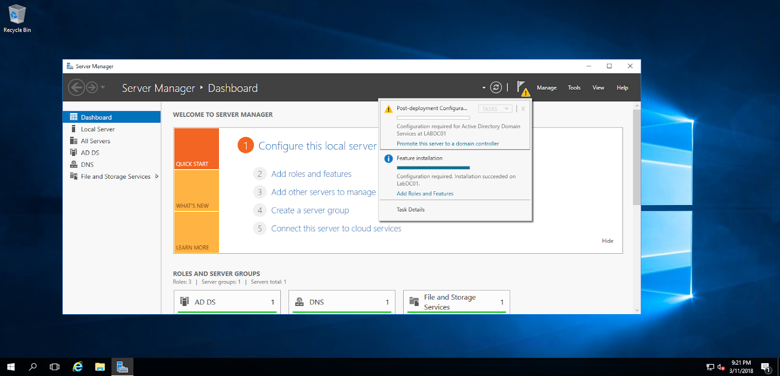 19. After installation, click the warning icon and then “Promote this server to a domain controller” wizard.