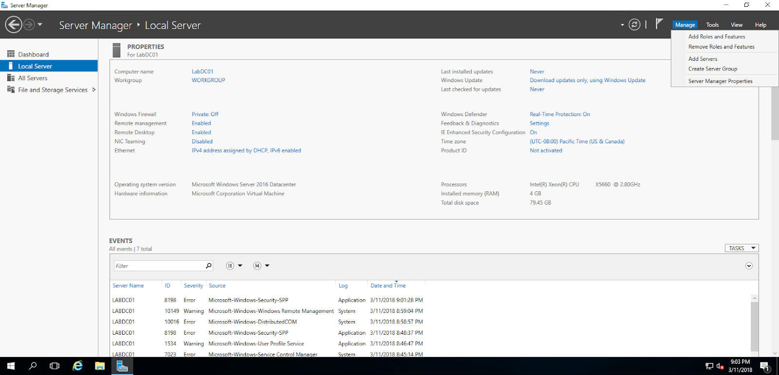 17. In the server manager that automatically opens when the server restarts, click “Manage > Add Roles and Features”