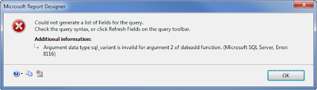 Many times when creating an SSRS report I get the message “Could not generate a list of fields for the query” especially when using datasources which include temporary tables or very complex queries. Sometimes clicking the Refresh fields button on the query toolbar does indeed fix the issue and other times it does not help.