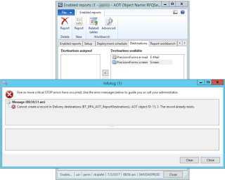Cannot create a record in Delivery destinations (BT_DPA_AOT_ReportDestinations). AOT object ID: 13, 2.
