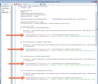 Add the following warning messages to the SysWorkflowDocument so that AX explicitly tells you what access is required in order to run the workflow.
